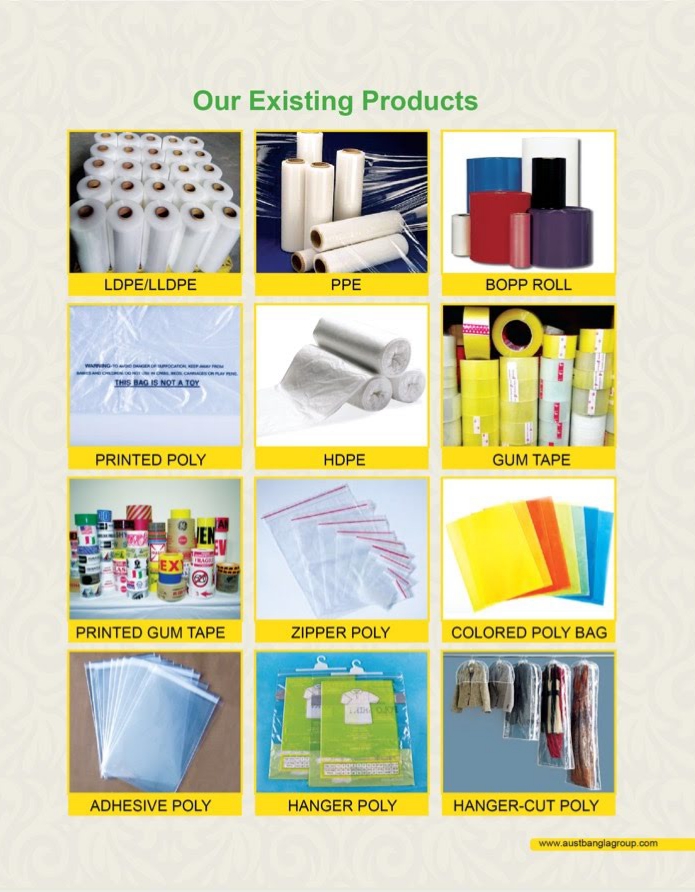 Check out our Products EXISTING PRODUCTS LDPE/LLDPE PPE BOPP ROLL PRINTED POLY HDPE GUM TAPE PRINTED GUM TAPE ZIPPER POLY COLORED POLY BAG ADHESIVE POLY HANGER POLY HANGER-CUT POLY